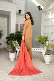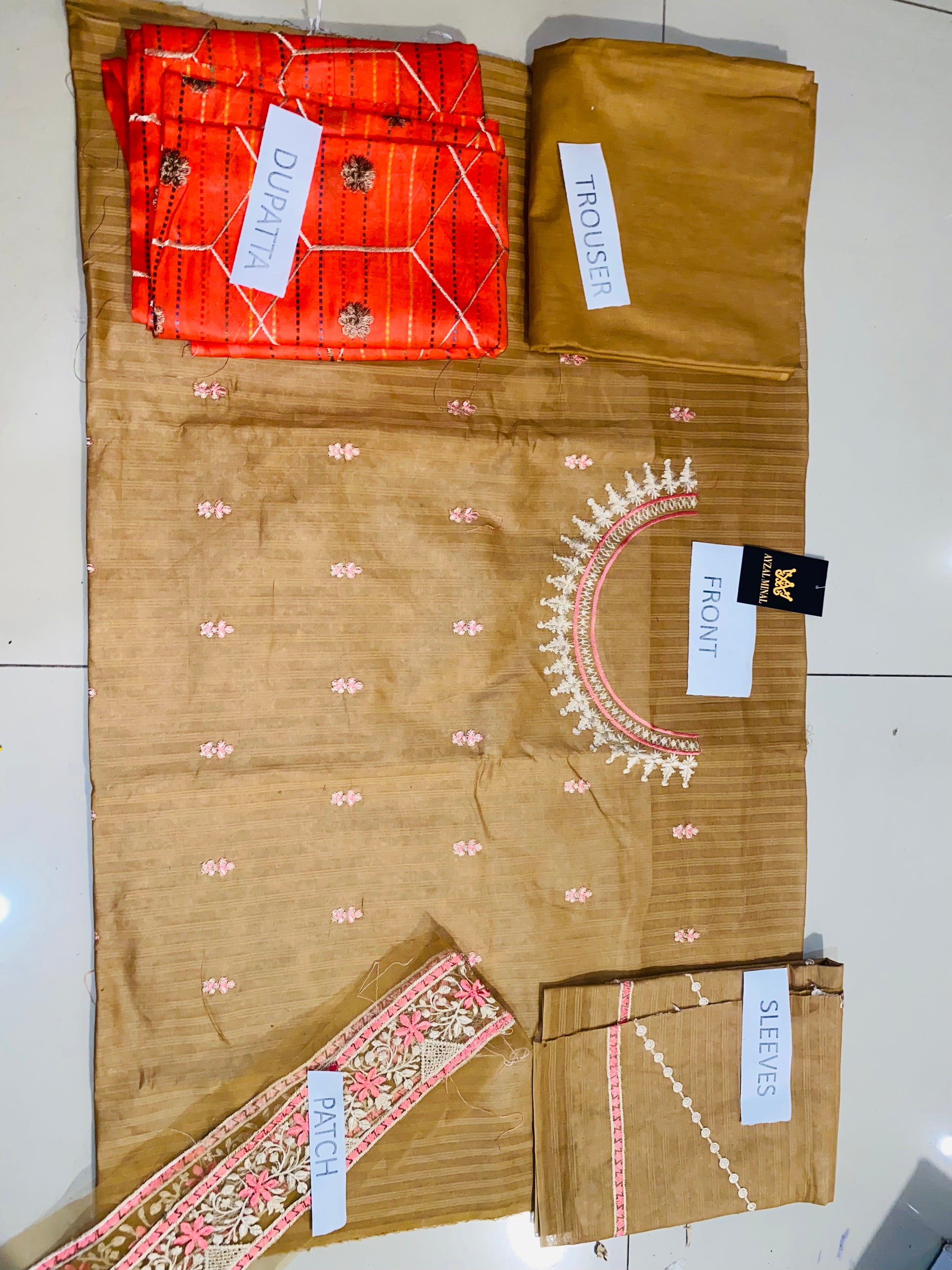 The intricately embroidered 35-inch shirt patch adds a luxurious touch to the outfit. Completing the ensemble is a 2.25-meter Rangoli dupatta, featuring a vibrant orange hue that beautifully contrasts with the amber tones, adding a vibrant and charming finish. Amber is perfect for any festive occasion, combining timeless beauty and modern elegance.