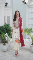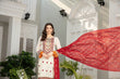An intricately embroidered 35-inch shirt patch enhances the outfit’s charm, while the additional neck patch adds an extra layer of detail to the neckline. The ensemble is completed with a 2.25-meter Rangoli dupatta, featuring a vibrant red hue that contrasts beautifully with the white, adding a bold and elegant finish. Daisy is perfect for festive occasions or casual wear, embodying timeless beauty and grace.