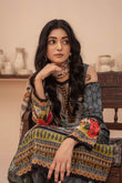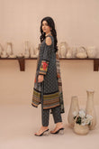 This outfit is meticulously designed with a 2.75-meter long shirt, 2.25-meter trousers, and a 2.25-meter dupatta, all fashioned from digital printed lawn. It features a rich dark green base adorned with vibrant red floral motifs. The intricate floral and geometric patterns add a touch of regal elegance to the attire. The combination of dark green and bright red creates a striking visual appeal, perfect for occasions that demand grace and style. The lawn fabric ensures the outfit is comfortable and airy, ideal for warm weather gatherings.