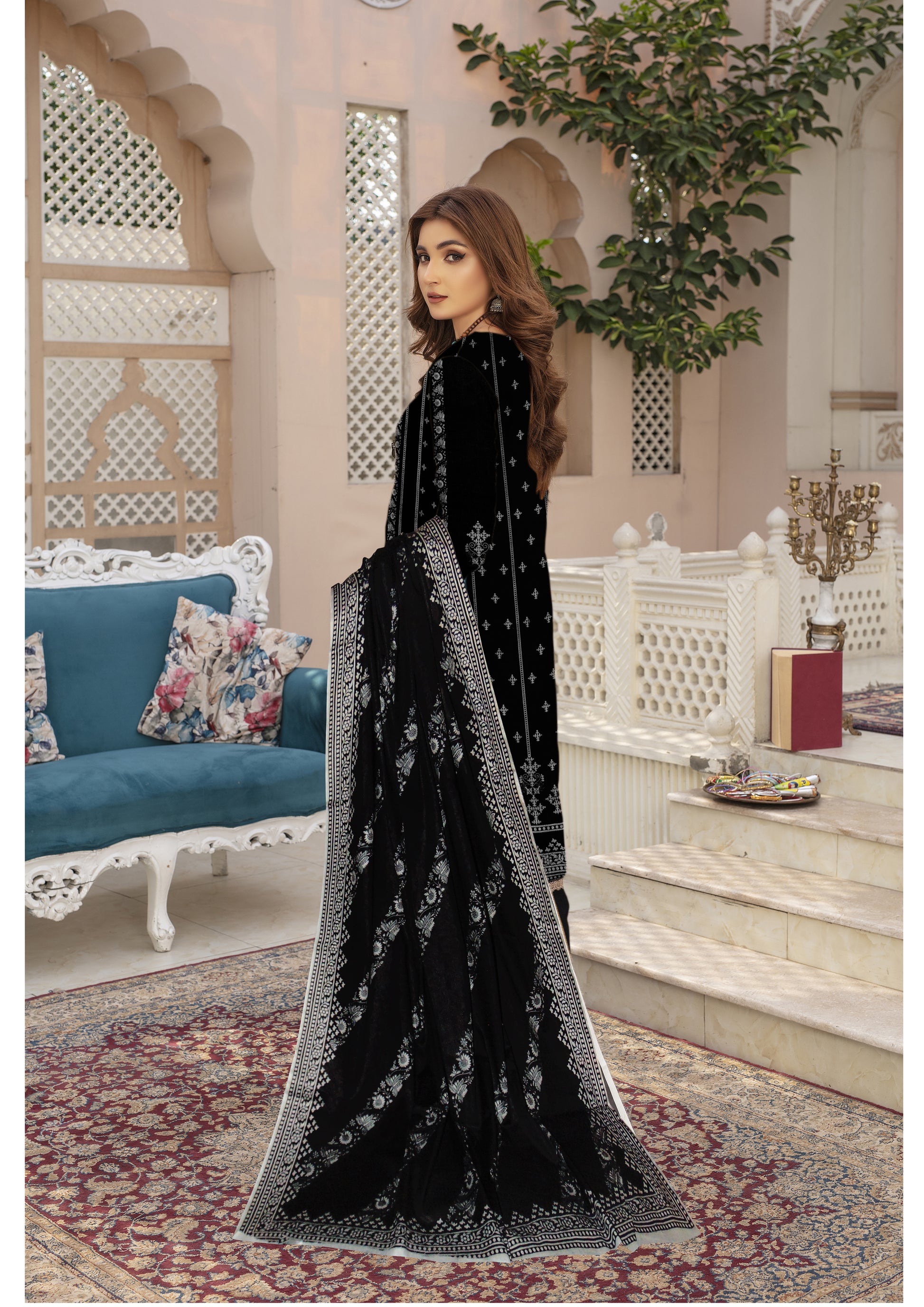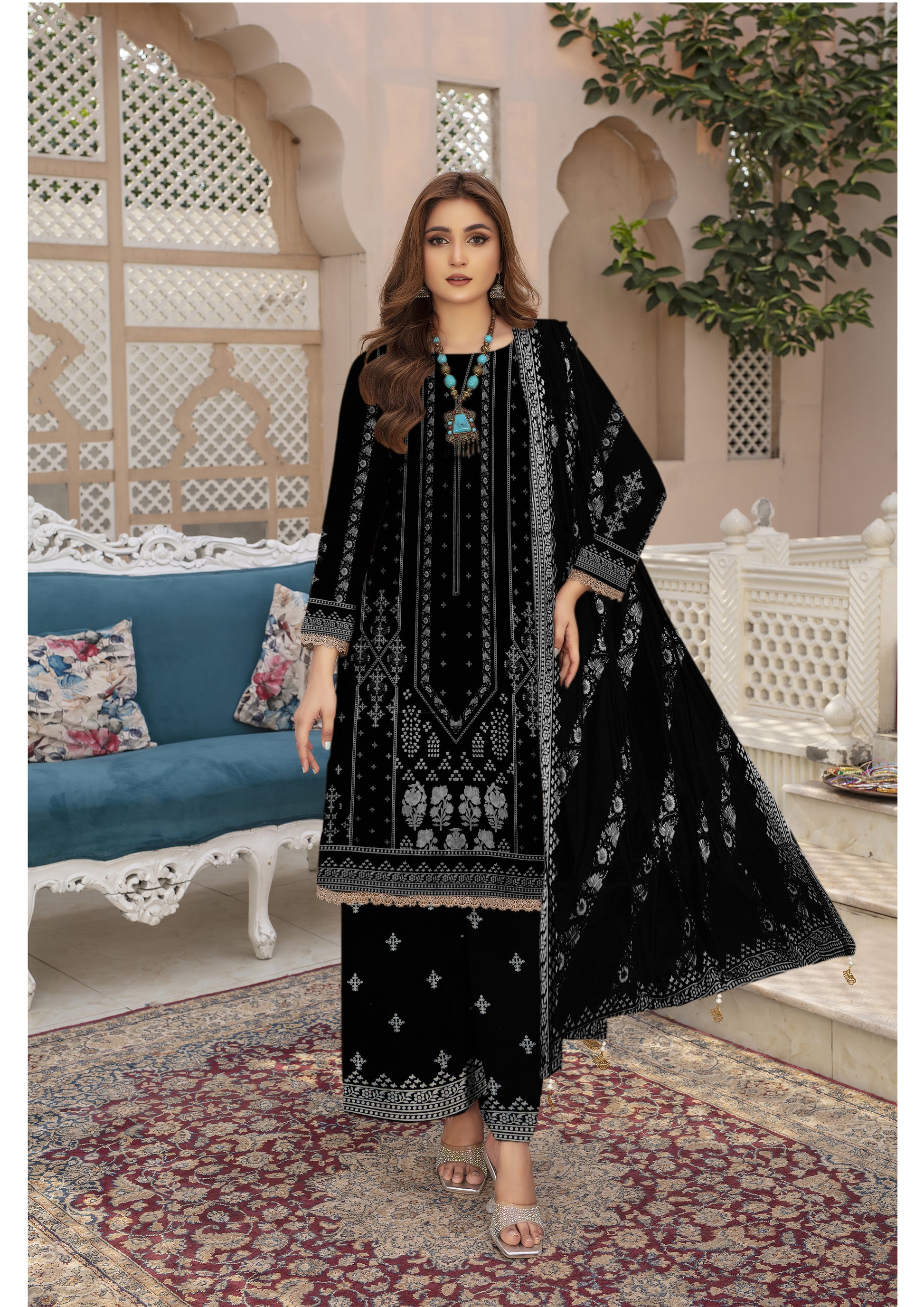 Noir: Unveil timeless elegance with our Vol 23 Luxe Collection 3-piece lawn suit. This stunning ensemble showcases a sophisticated black design with intricate patterns, set against a rich dark backdrop. Complemented by a 2.25m matching printed lawn dupatta and trousers, this outfit exudes effortless style and grace. Perfect for those who appreciate classic beauty in their wardrobe.