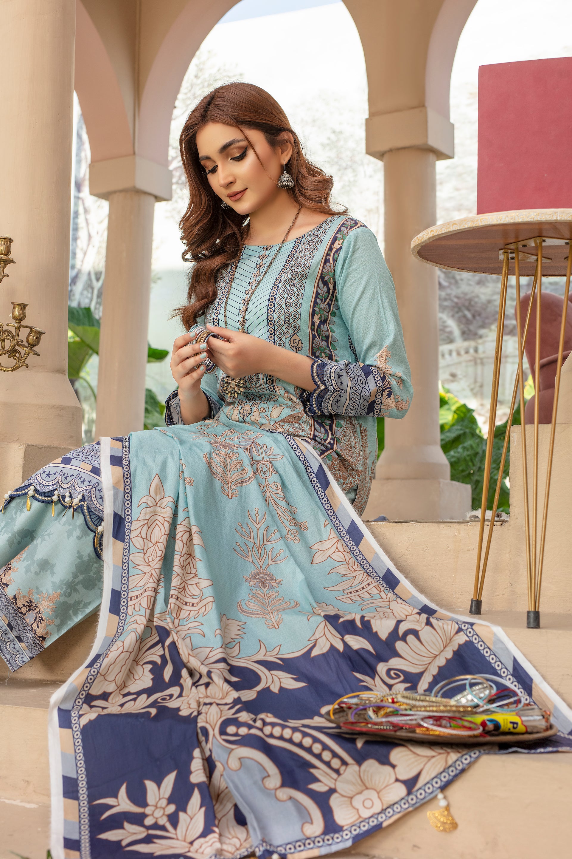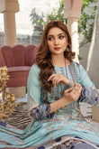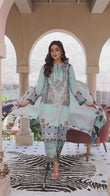 This outfit is meticulously designed with a 2.75-meter long shirt, 2.25-meter trousers, and a 2.25-meter dupatta, all fashioned from printed lawn. It features a delightful light blue base with navy and golden accents in detailed traditional patterns. The prints include floral and ornamental motifs that add a touch of regal elegance to the attire. The combination of light and dark blue creates a harmonious visual appeal, perfect for occasions that demand grace and style. The lawn fabric ensures the outfit is comfortable and airy, ideal for warm weather gatherings.