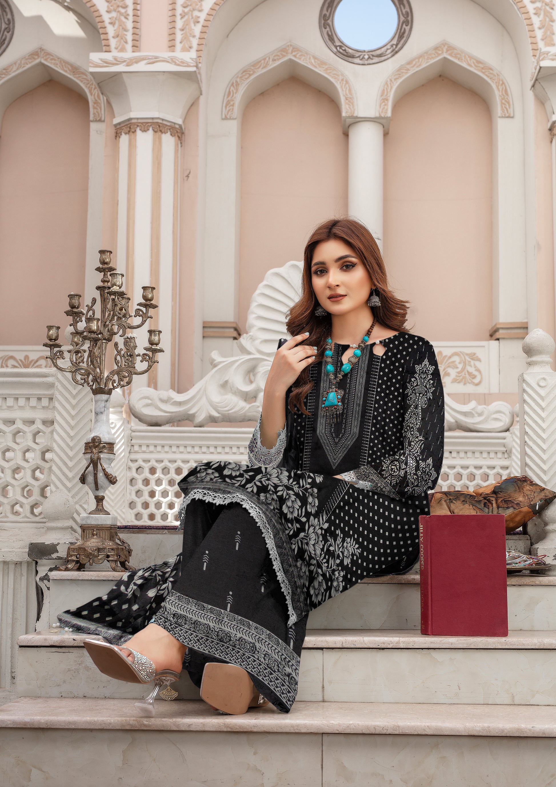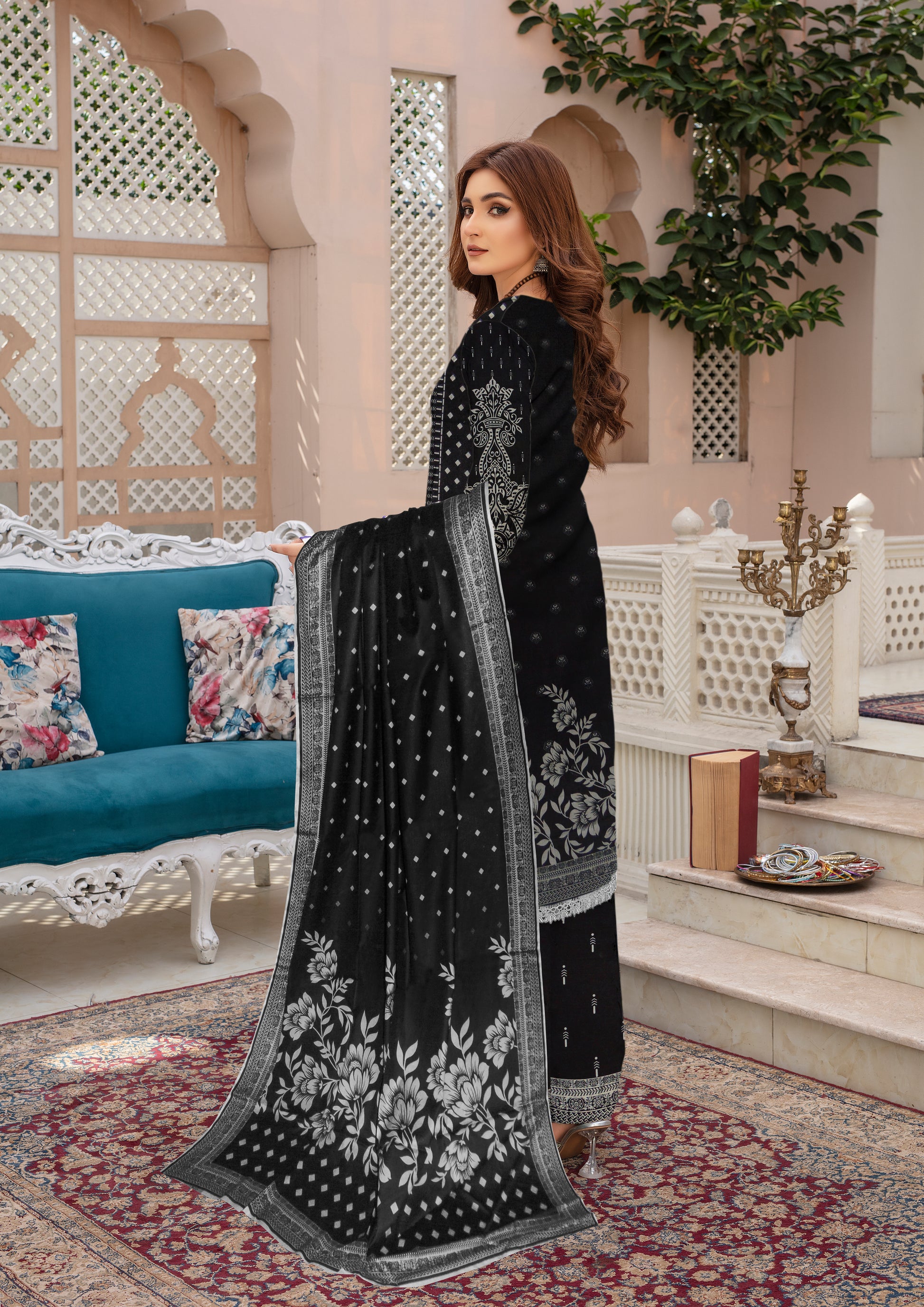 Elevate your style with our Vol 23 exclusive 3-piece suit, featuring a striking black floral design on premium lawn fabric. This set includes a 2.75m printed lawn shirt with sleeves, 2.25m printed lawn trousers, and a 2.25m printed lawn dupatta, perfectly combining traditional elegance with modern sophistication.