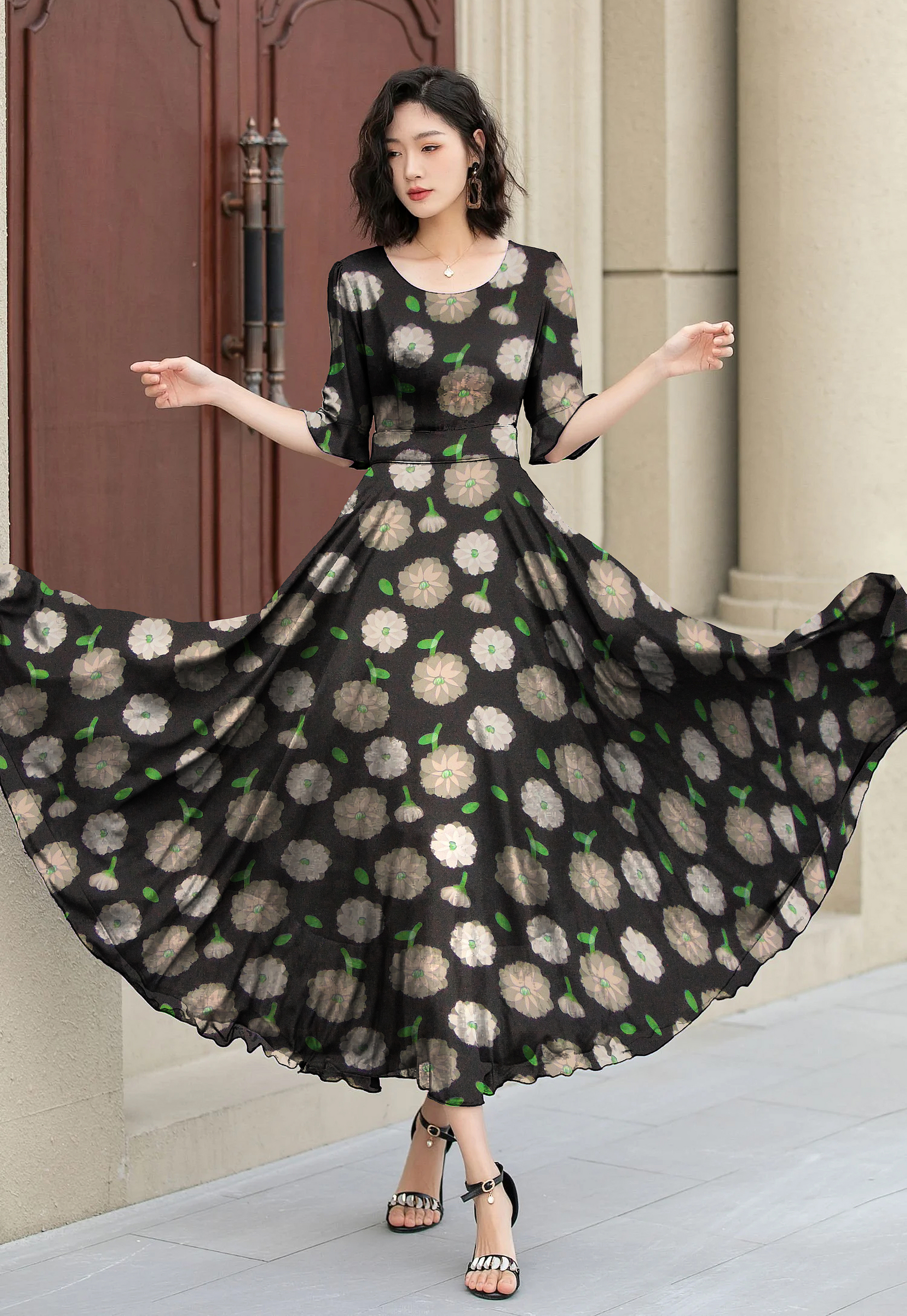 Elevate your wardrobe with the Ravissante Georgette Dress, featuring a sophisticated black base beautifully adorned with green, white, and golden floral patterns.
