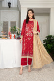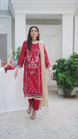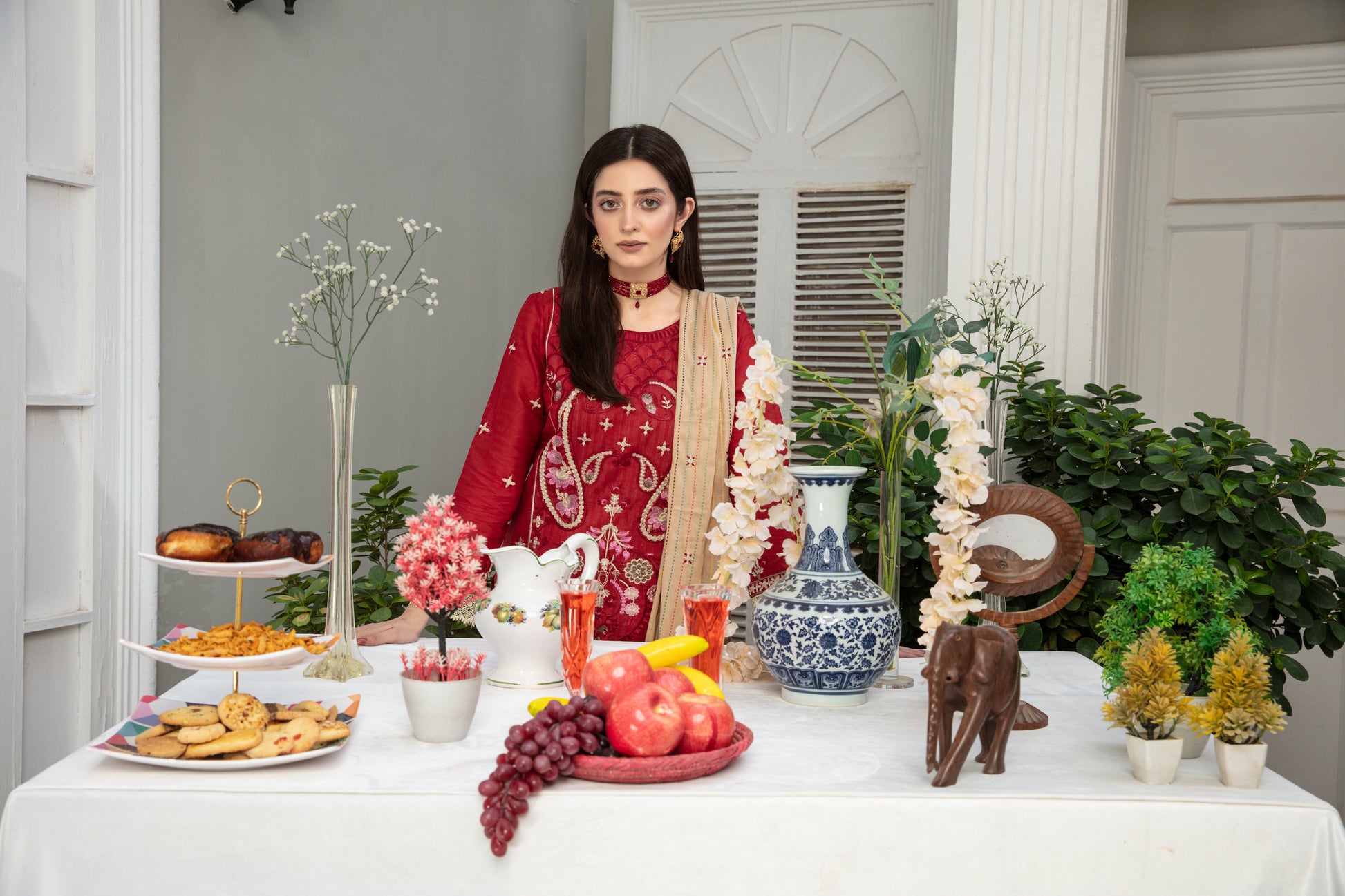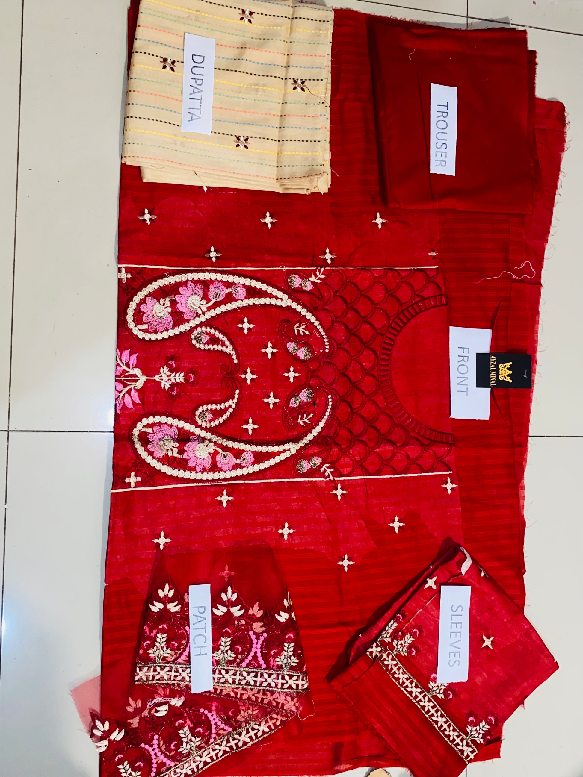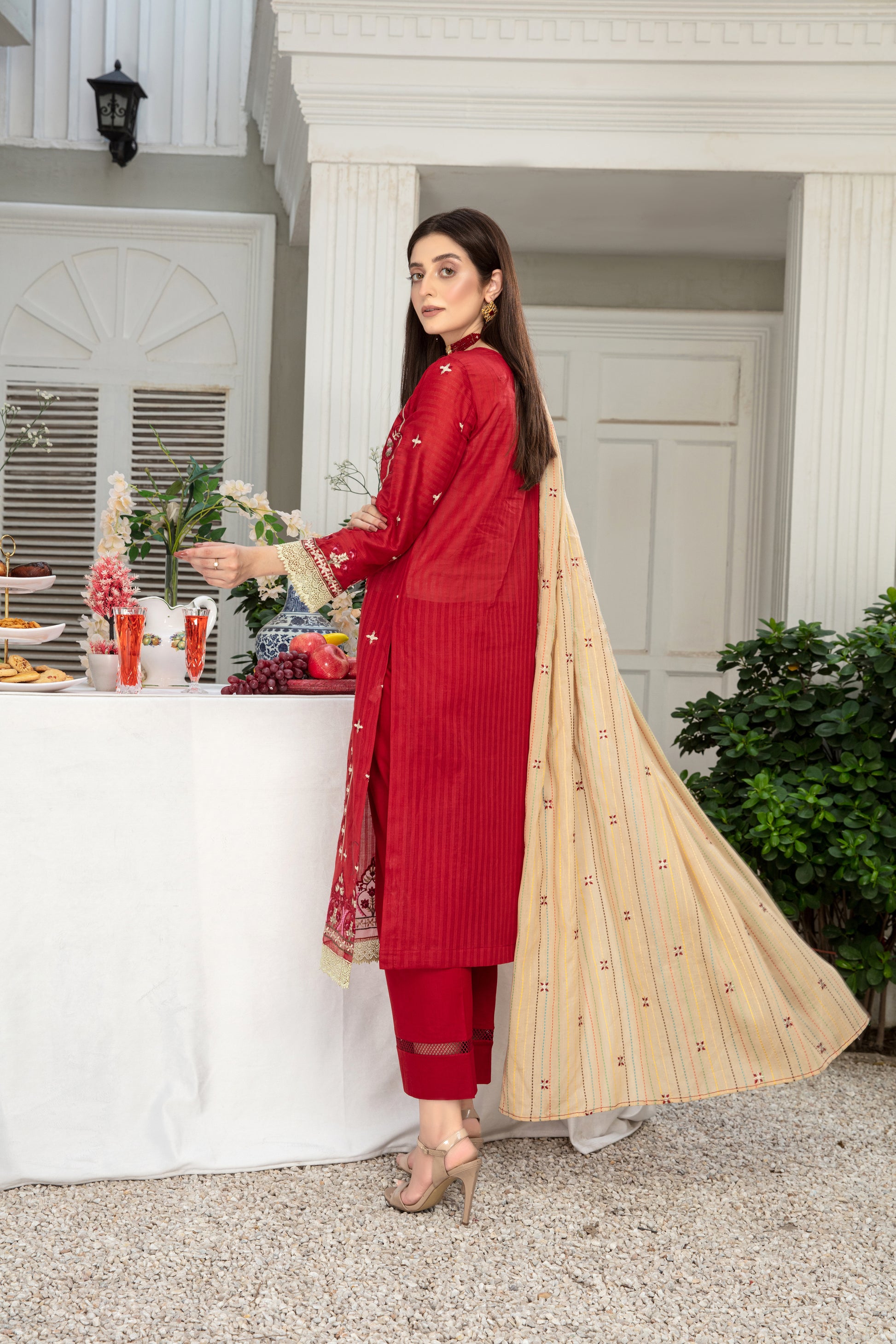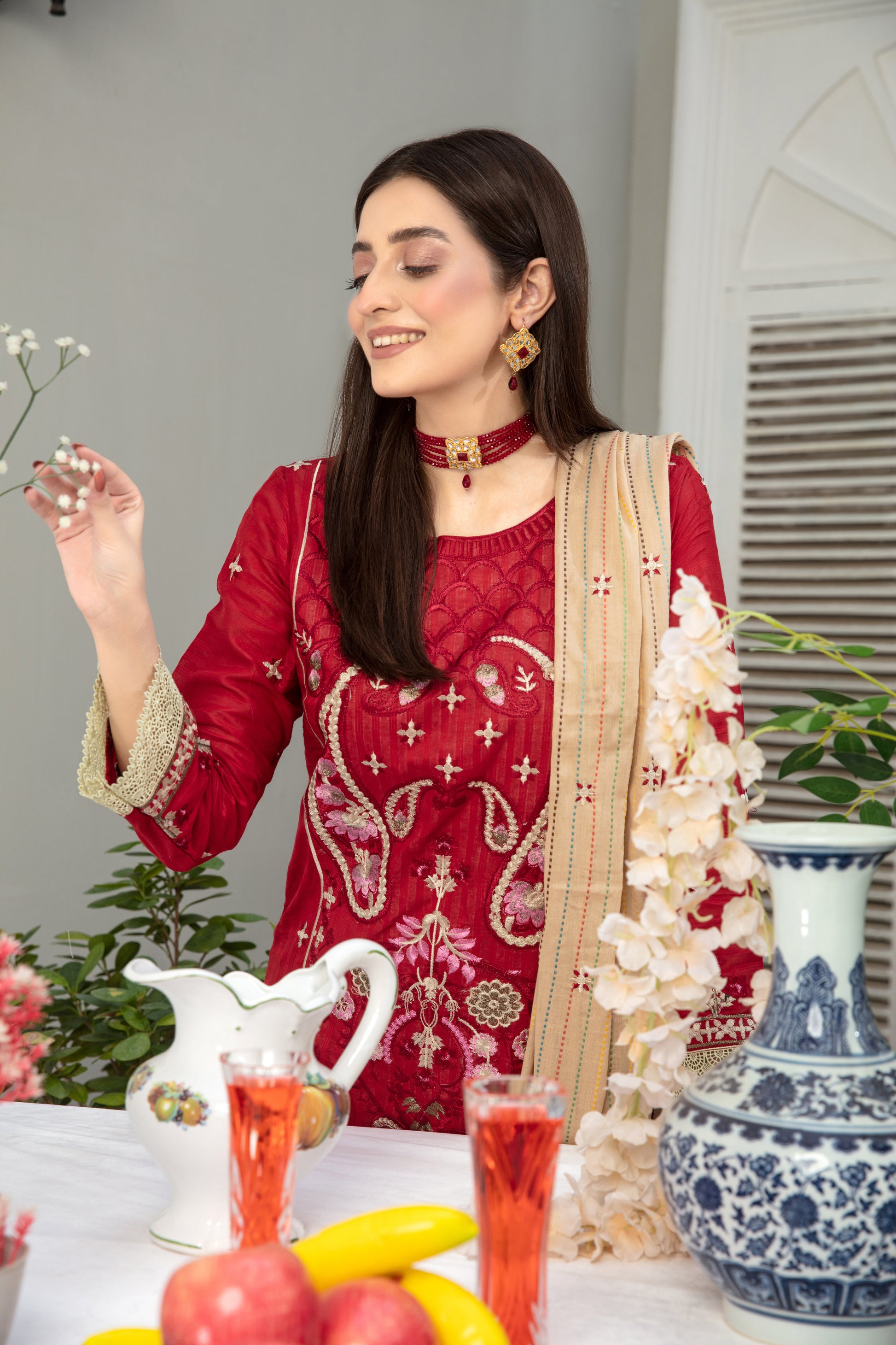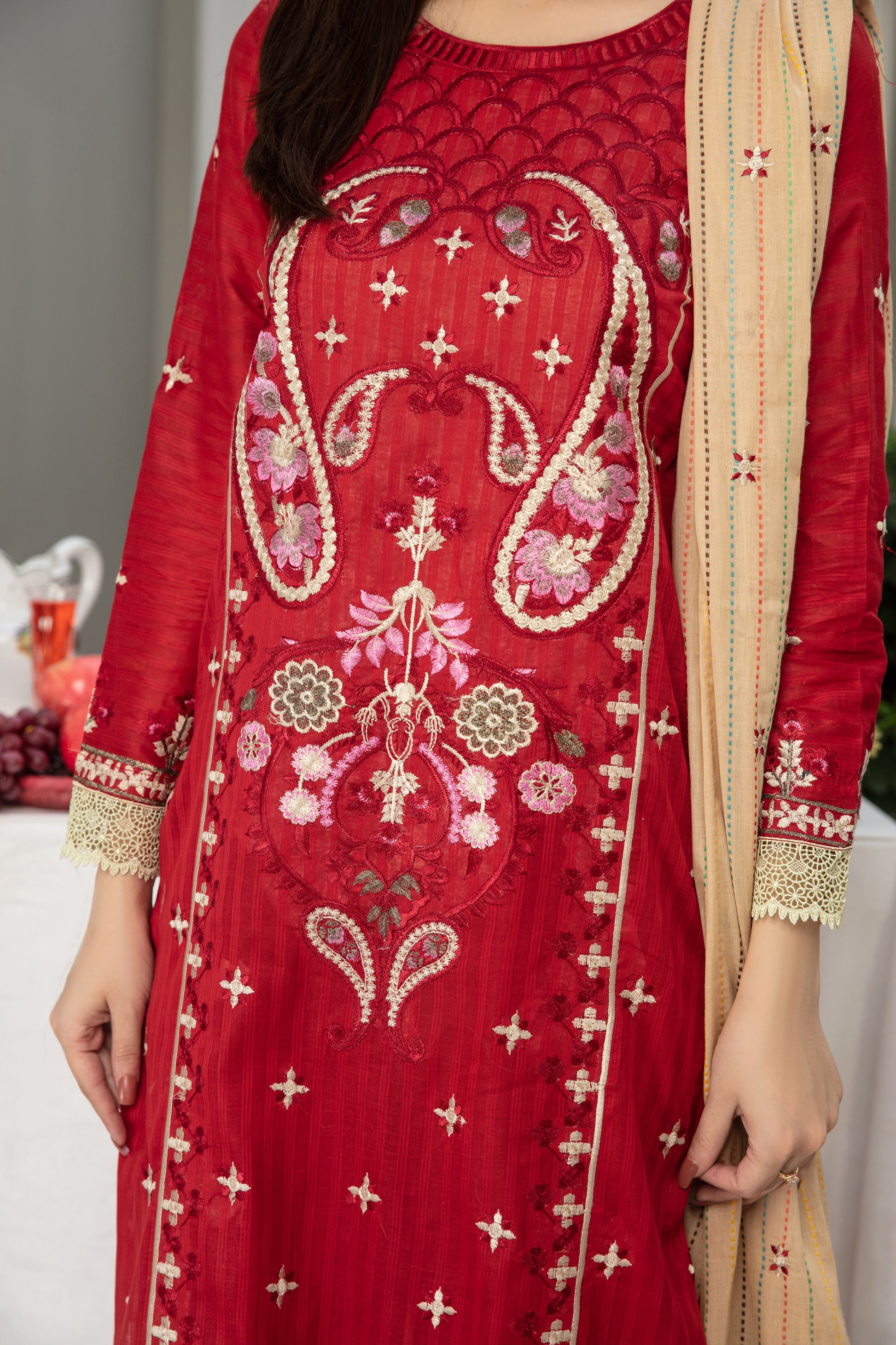 Ruby radiates charm and elegance with its vibrant red hue and intricate embroidery. The outfit features a shirt and back crafted from 2.5 meters of slub lawn fabric, providing a comfortable and stylish fit. The 26-inch sleeves add to the overall grace of the ensemble. The trousers, made from 2.25 meters of lawn fabric, ensure both comfort and style.