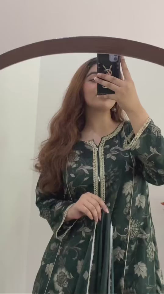 Collection Name: Azadi Special Description: Izhar: This outfit is a three-piece lawn ensemble perfect for celebrating Independence Day. The shirt is adorned with a rich, deep green background featuring intricate floral patterns...