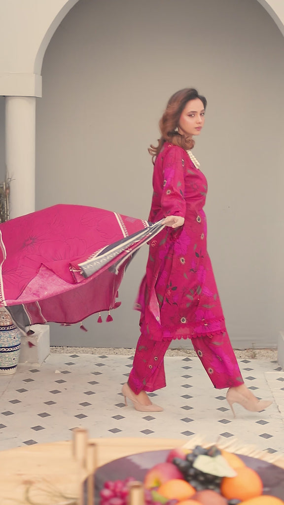 Collection Name: Dilbahar Description: Opal 3-Piece Lawn Suit A stunning blend of elegance and modernity, Opal is designed to captivate with its serene peach canvas adorned with delicate floral motifs in lush pink...
