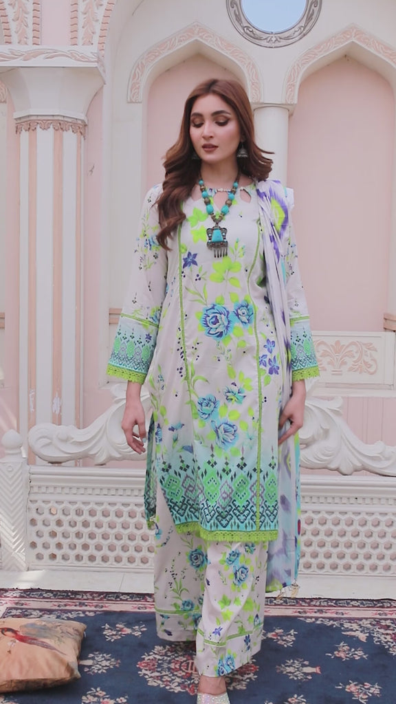 Collection Name: Ulfat Description: This outfit showcases a 2.75-meter long shirt, 2.25-meter trousers, and a 2.25-meter dupatta, all expertly crafted from printed lawn. The design features a lively mix of blues,...