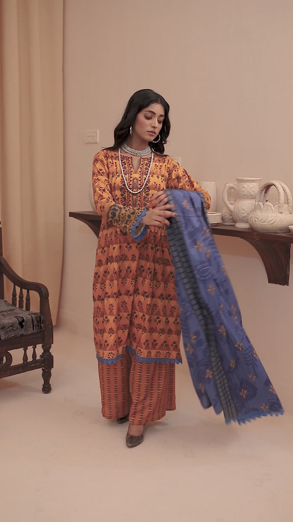 Collection Name: Dilkash Description: Sunset: Shine bright with this 3-piece lawn suit from the Dilkash collection 2024. The kameez features a warm amber hue adorned with intricate blue floral motifs and...